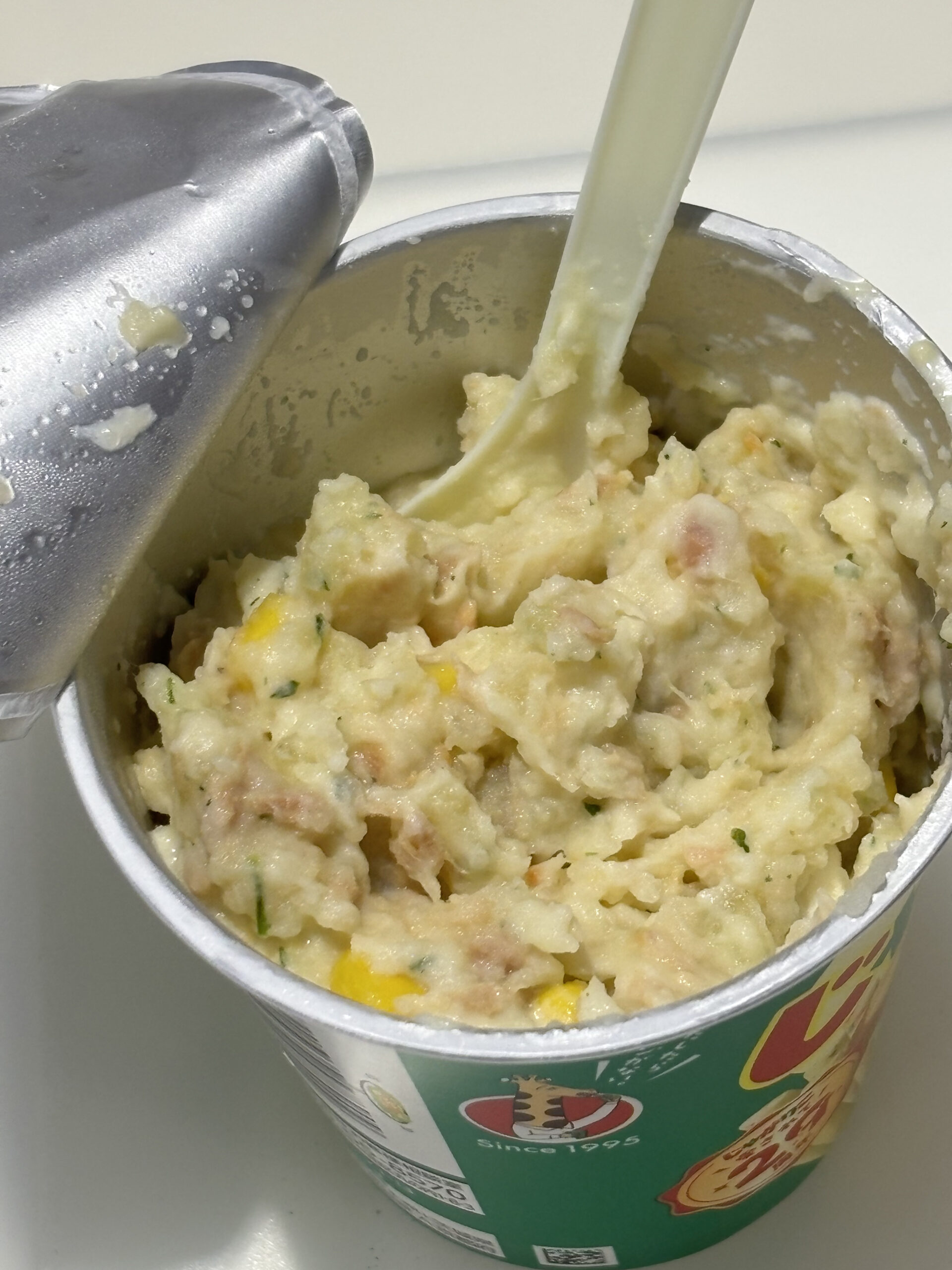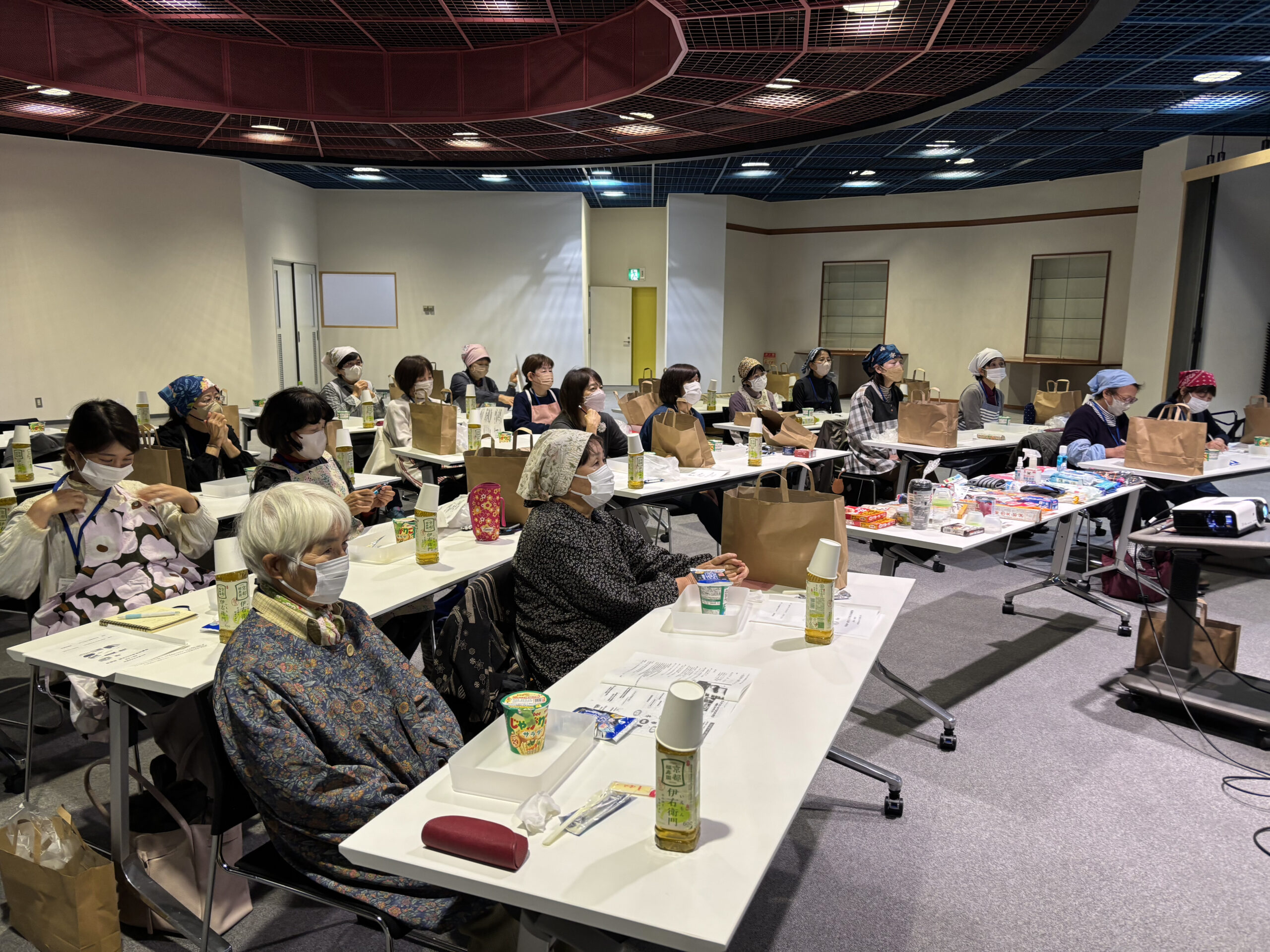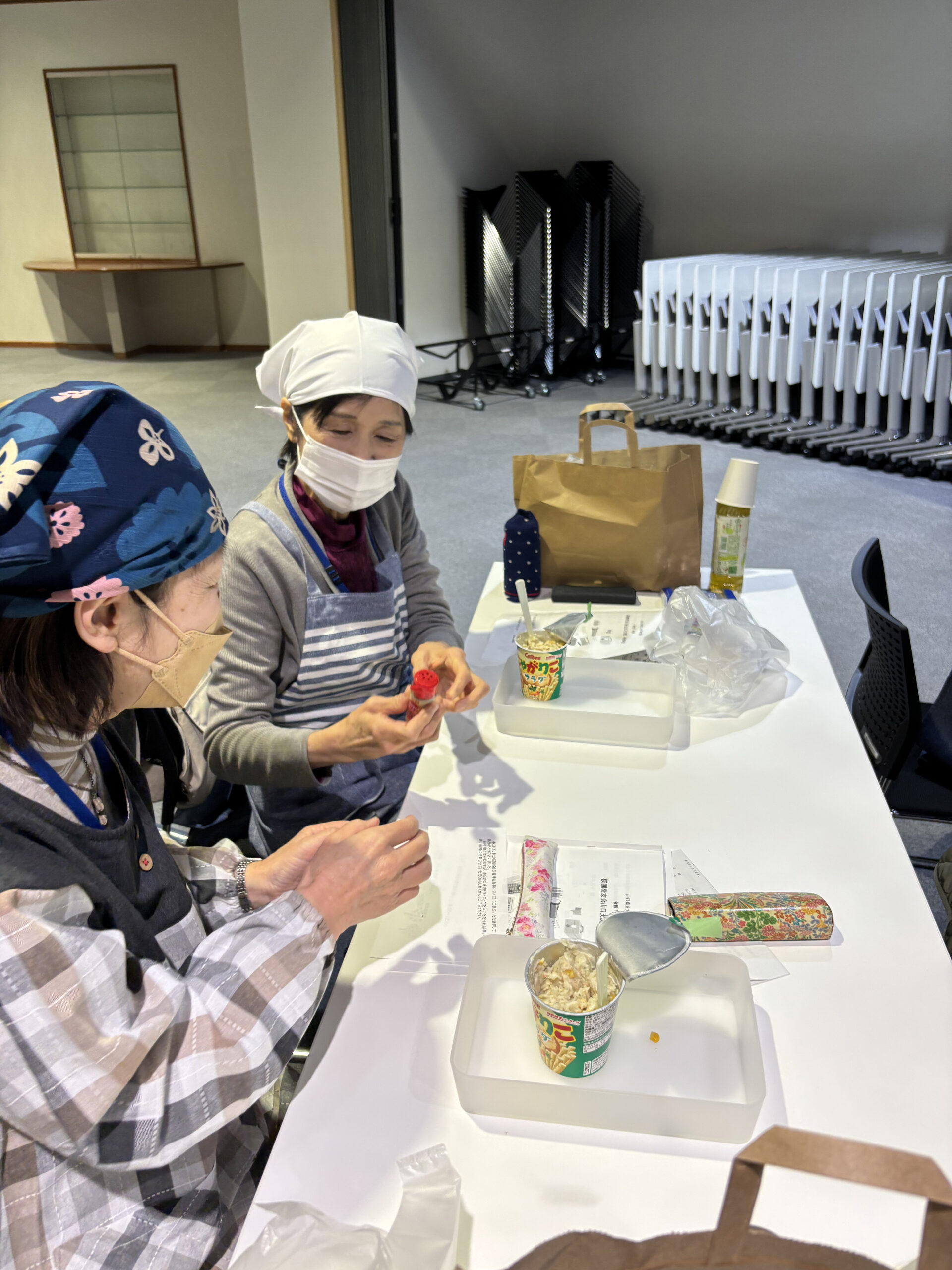 また実習では、じゃがりこサラダを作って試食しました。お湯を注いでコーン・ツナ・チーズを入れて混ぜると、サラダに変身。参加者の方からの感想では、「美味しくてびっくりでした。簡単にできる非常時の食事を実際に初めて作りました。ぜひ子どもや孫と作ってみたいです。」などがありました。